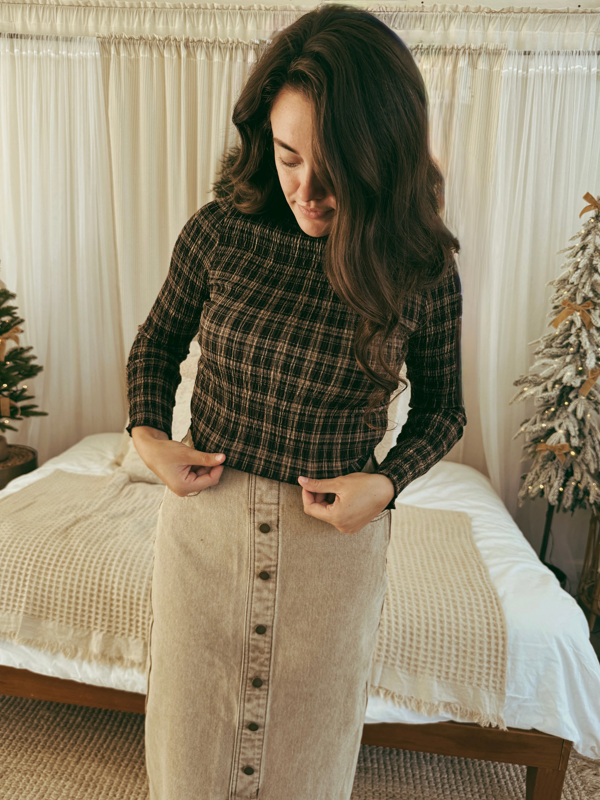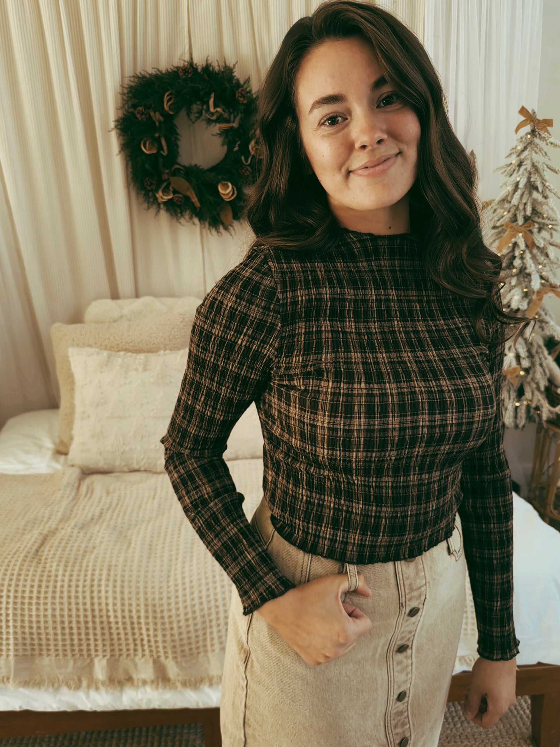 - Brown plaid long sleeve top